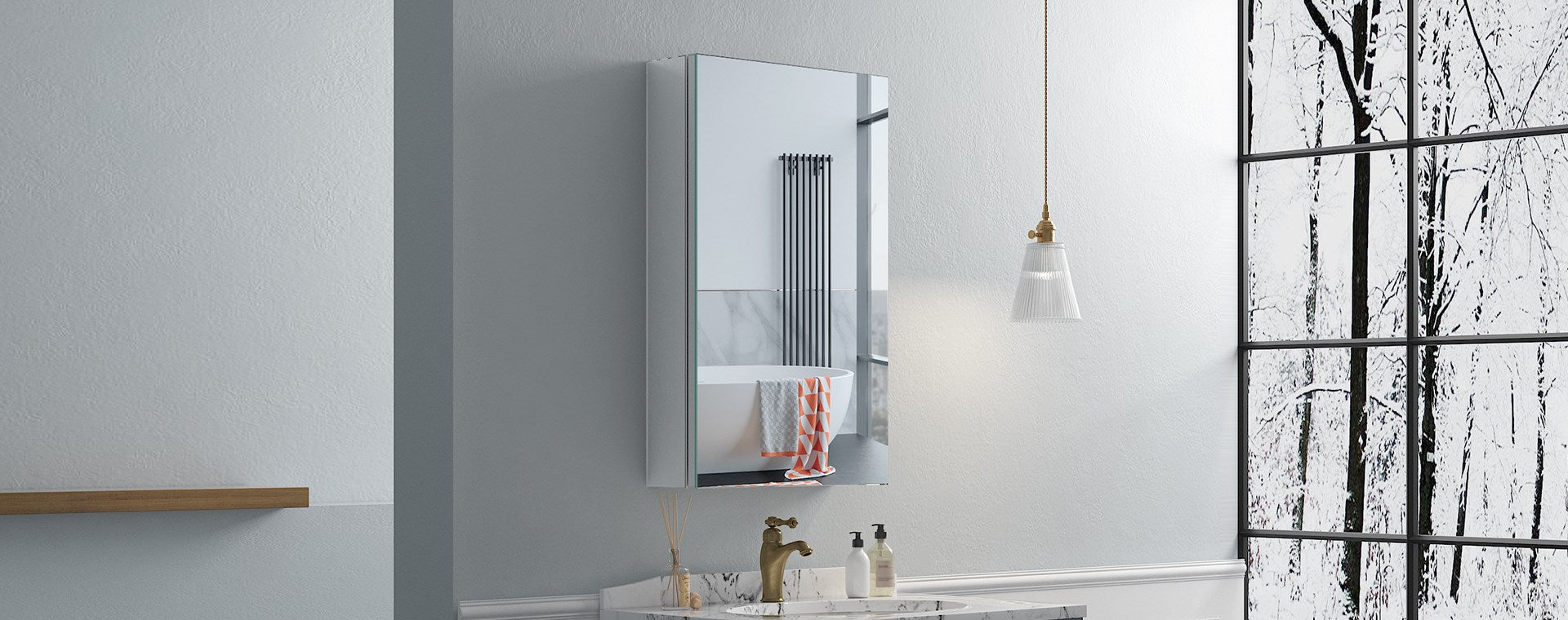 I have been relegated to this small bathroom in our house. I am grateful, but it used to just have a single wall mirror and no shelves. This mirrored bathroom cabinet was super easy to set up and works great. The mirrored edges are a nice touch and with the mirrors on the inside and inside door, it is nice to be able to see more of my head. Mostly because I shave my head and my kids make fun of me when I miss a spot. So this virtually 190 degree view has saved me a lot of insults.it does get finger prints on it, so I have to clean it regularly, but overall it has been a huge improvement!